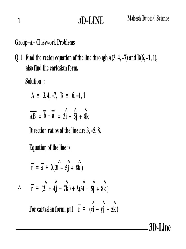 Solution method i. Use and keys on keyboard to move between field in calculator. Equation of line in vector and cartesian form for three dimensional 3d class 12 maths iit jee mains advanced ncert solutions by hariom dubey hd sir ex facult. In order to understand lines in 3d one should understand how to parameterize a line in 2d and write the vector equation of a line.