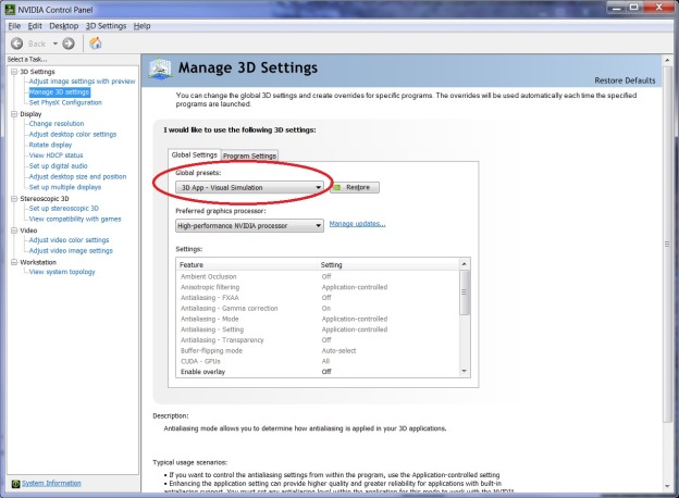 The global settings tab allows you to assign global settings that will be applied to all 3d games. To set a default 3d setting. Click the global settings tab. If you have an nvidia quadro product installed then click the global presets list arrow and select one of the pre installed global settings for workstation applications.