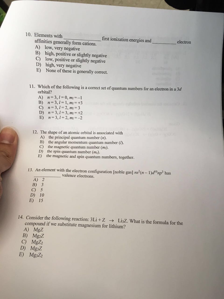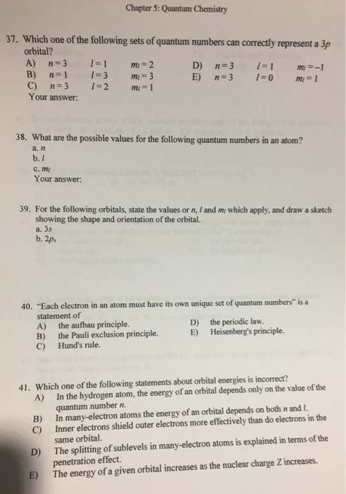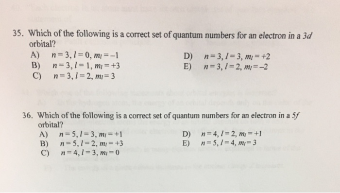 Assuming the electron is in the lowest states and the atom is neutrally charged it will fill an orbital before extending the next one. Principal quantum number n energy level in orbitals and its value could be any positive integer starting from 1 angular momentum quantum number l has to be at least 1 less than n range of values from 0 up to n 1 and each. Which of the following is a correct set of quantum numbers for an electron in a 3d orbital. Each electron in an atom must have its own unique set of quantum numbers is one way to state a the aufbau principle.